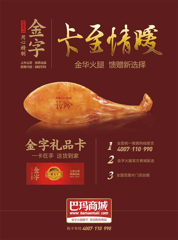 作為一家上市公司——金字火腿推出的禮品卡,禮品卡多年信譽(yù),廣受消費(fèi)者的真心歡迎,每年回頭客無(wú)數(shù),而更重要的是,金字每年把產(chǎn)品的品質(zhì)和備貨做到更好,禮品卡內(nèi)產(chǎn)品都是公司層層品質(zhì)歷練的熱銷(xiāo)產(chǎn)品,用火腿、臘肉、香腸這些實(shí)在心意,去感動(dòng)每一位朋友。如今,更是可以通過(guò)手機(jī)微信關(guān)注金字火腿,盡享中華美食同時(shí),與朋友分享禮品卡里所蘊(yùn)含的真情實(shí)意。