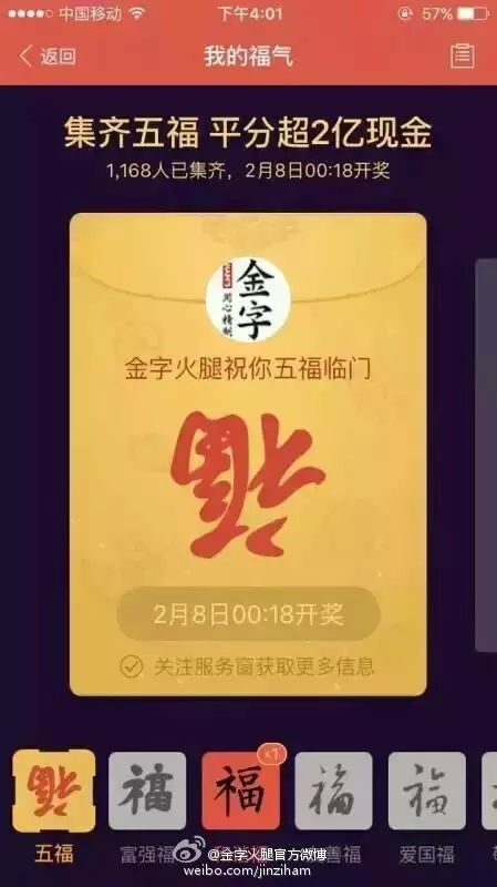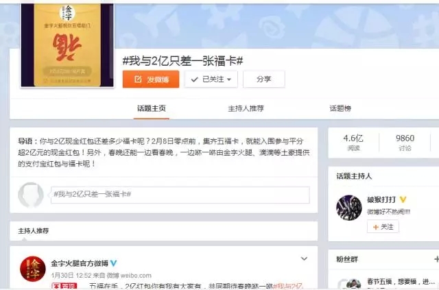 自前幾天支付寶將“集5福,搶2億+紅包”的活動(dòng)規(guī)則公布后,一時(shí)間,有關(guān)??〒Q贈(zèng)的話題強(qiáng)行霸屏。在有金字粉絲集齊了五福后,金字順勢(shì)在微博平臺(tái)上策劃的#我與2億只差一張福卡#的微話題就引發(fā)了高達(dá)4.6億的閱讀量,網(wǎng)友們通過(guò)點(diǎn)贊評(píng)論及轉(zhuǎn)發(fā)分享的方式,第一時(shí)間表達(dá)了自己對(duì)于五福??ê痛和?億紅包的高度期待!