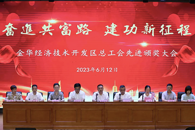 日前,6月12日下午,金華開發(fā)區(qū)總工會在李漁小學(xué)報告廳召開“奮進(jìn)共富路,建功新征程”先進(jìn)頒獎大會。經(jīng)申報、推薦、審查、評審和公示等環(huán)節(jié),我單位陳順通、姜濤二位員工榜上有名。生產(chǎn)副總監(jiān)陳順通被授予2023年度“八婺金匠”榮譽(yù)稱號,生產(chǎn)副總監(jiān)姜濤被授予2023年“金開工匠” 榮譽(yù)稱號。